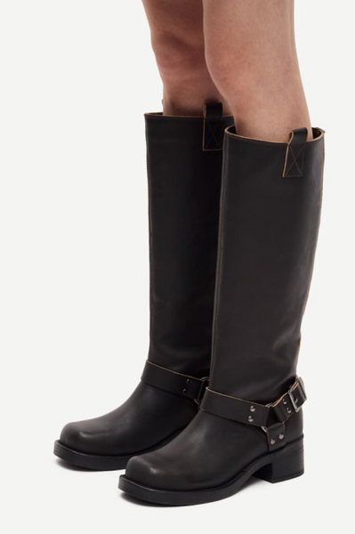 Knee-high heeled boots with a rubber outsole. Buckle at the at the ankle and metal detailing. Straight shaft. Slightly squared toe. Main material made from 100% cow leather. Made in Portugal. This product contains leather sourced from LWG-certified suppliers. LWG promotes responsible environmental practices across the leather supply chain.
