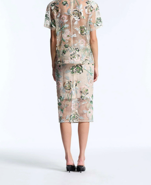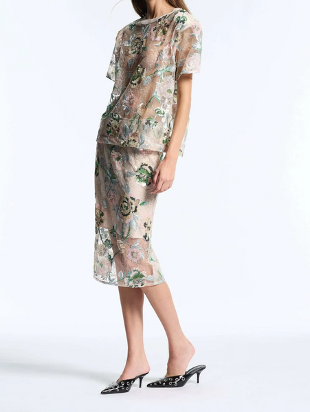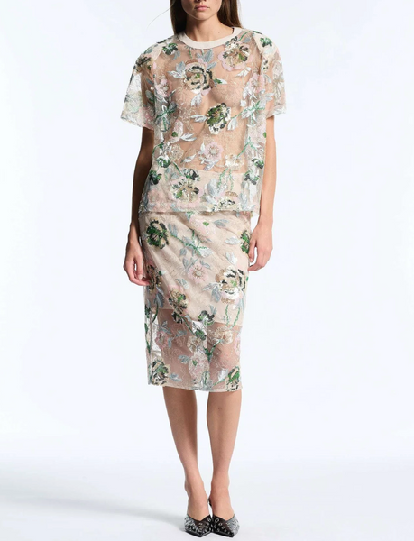 Introducing the Beaded Midi Skirt a custom embroidered arrangement. Reminiscent of flora catching light by the pond, it is a casual, though lustrous and weighted alternative to the everywoman’s wardrobe staple. Perfect for the mid-seasonal shift, or layered for seasonal changes.