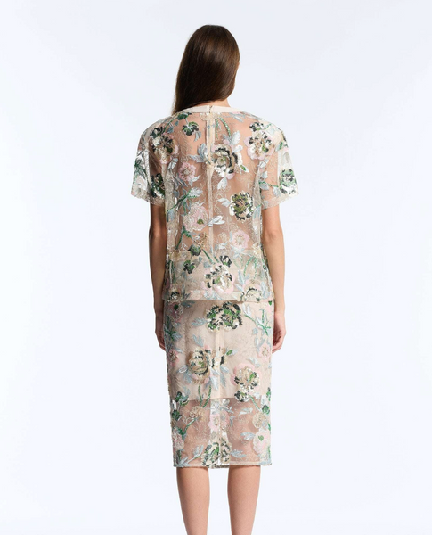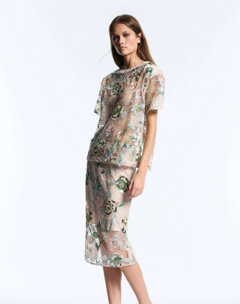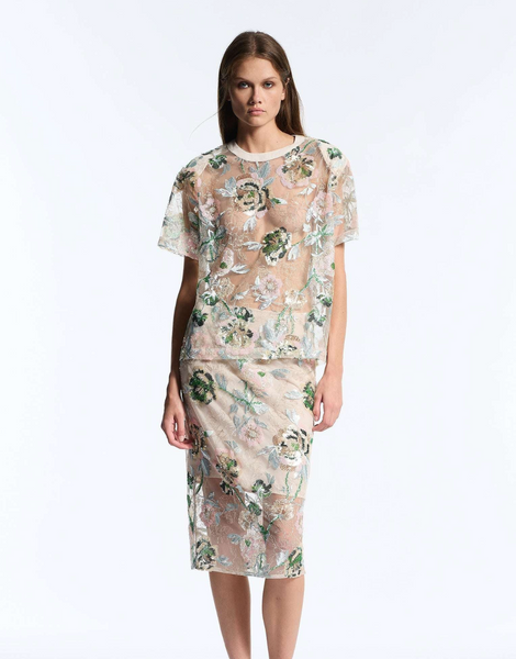 A sophisticated upgrade on an everlasting classic, the Beaded Box tee is a lustrous and sheer alternative to the staple tee. With loose short sleeves, a relaxed drop shoulder, and a subtle ribbed-knit collar detail, this piece brings effortless elegance and uplifting casual style. True to size, with a boxy fit. Size up for a more oversized fit.