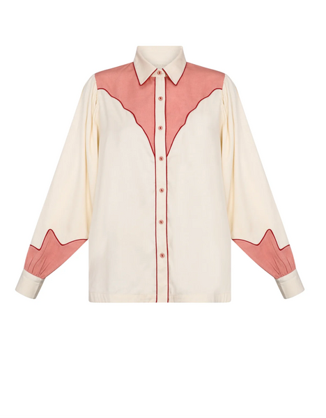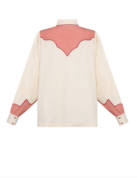 Rose pink western-style yoke and sleeve panels outlined with red piping and matching buttons