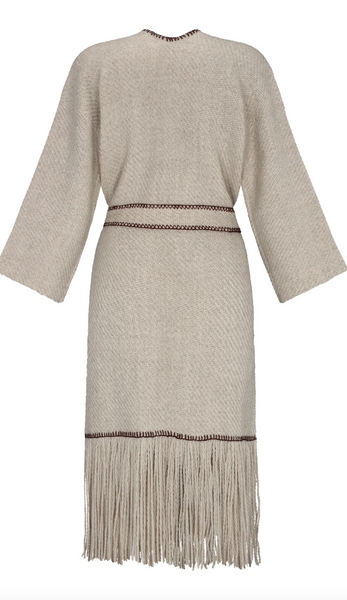 Beige knit coat styled with a matching belt tied at the waist