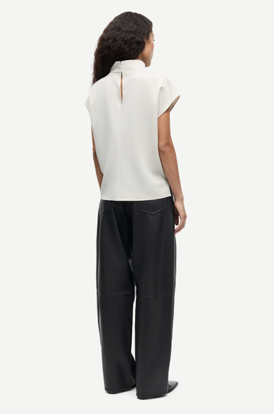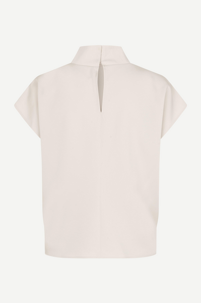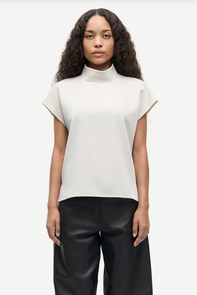 Short-sleeved top with a loose fit and dropped shoulders. Loop and button closure at the back. High neck. Main material made from an elastic blend of recycled polyester.