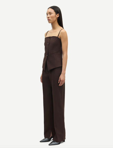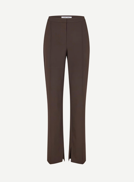 Mid-waist trousers with a regular fit and straight leg. Hidden hook and zipper closure at the fly. Side slit pockets on the front. Pressed creases on the front and back. Main material made from an elastic blend of recycled polyester.
