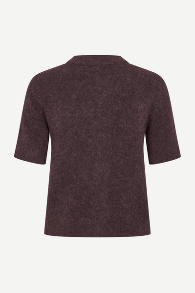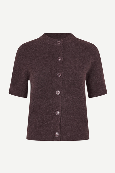 Short-sleeved cardigan with a regular fit. Button closure on the front. Rib-knitted collar, cuffs, and hem. Round neck. Main material made from an elastic blend of wool, alpaca wool, and recycled polyester.