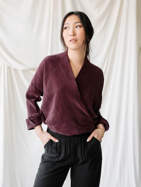 The Twist Blouse is criss-crossed in the front. Shorter front hem gives the illusion of that "half- tucked" polish. Back hem is longer. Sleeve cuffs. We love the sleeve rolled up to the elbow for an easy, relaxed look.